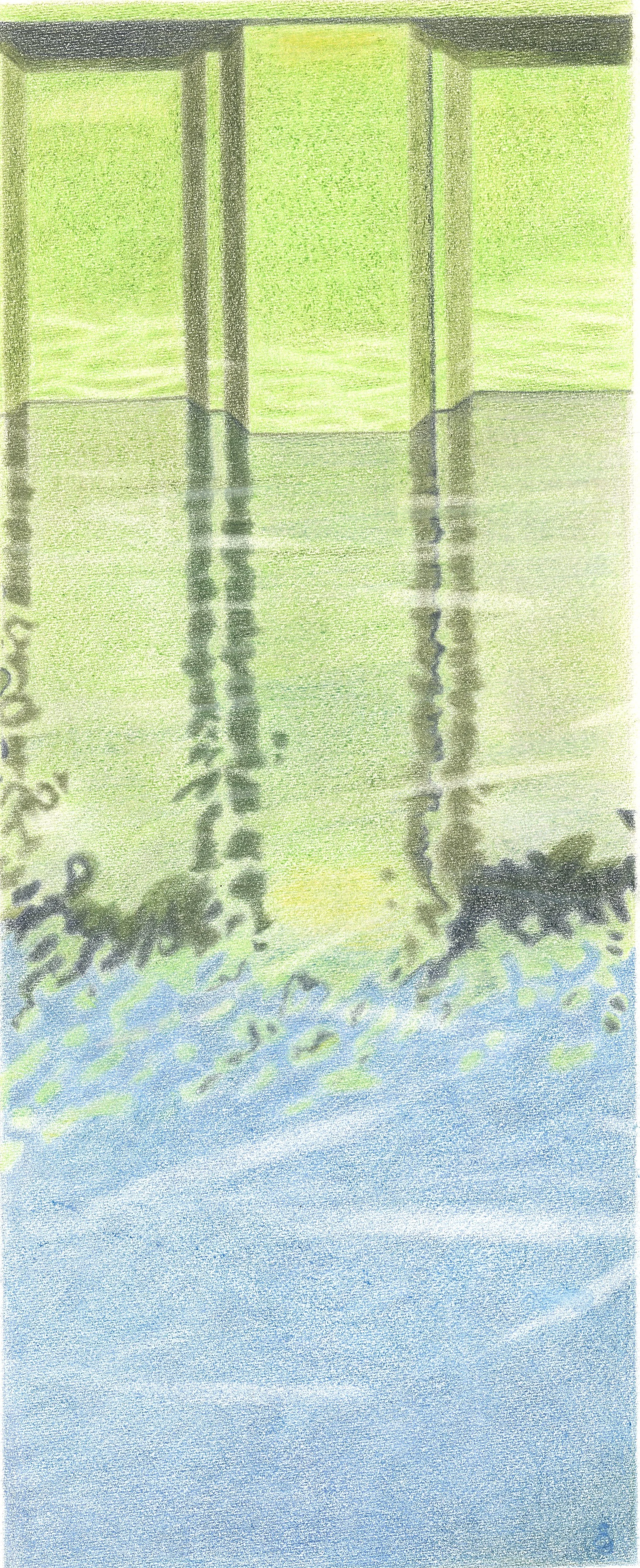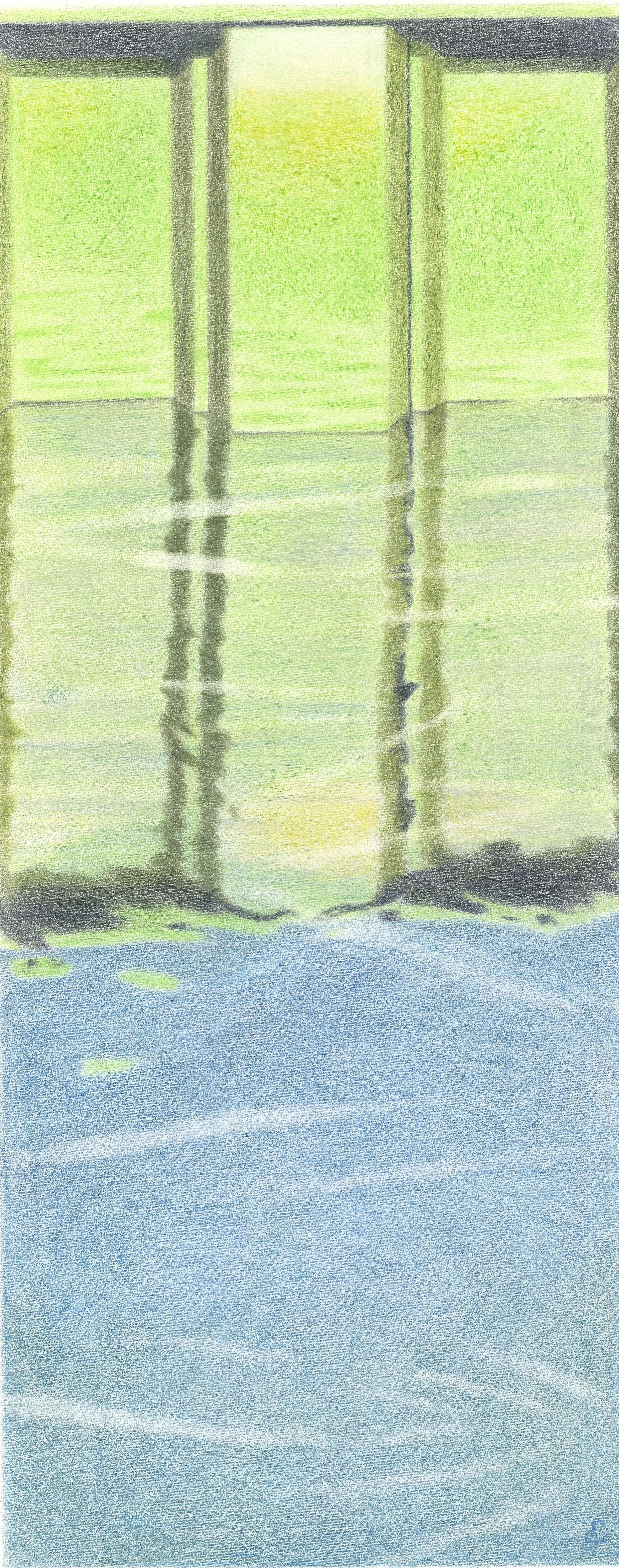 “Meandering river, through meadows then harbour to the sea. Waters contained, but not constrained, by timbering and sheet steel piling. Colours of chromium, cobalt, pine and tannegrun.”